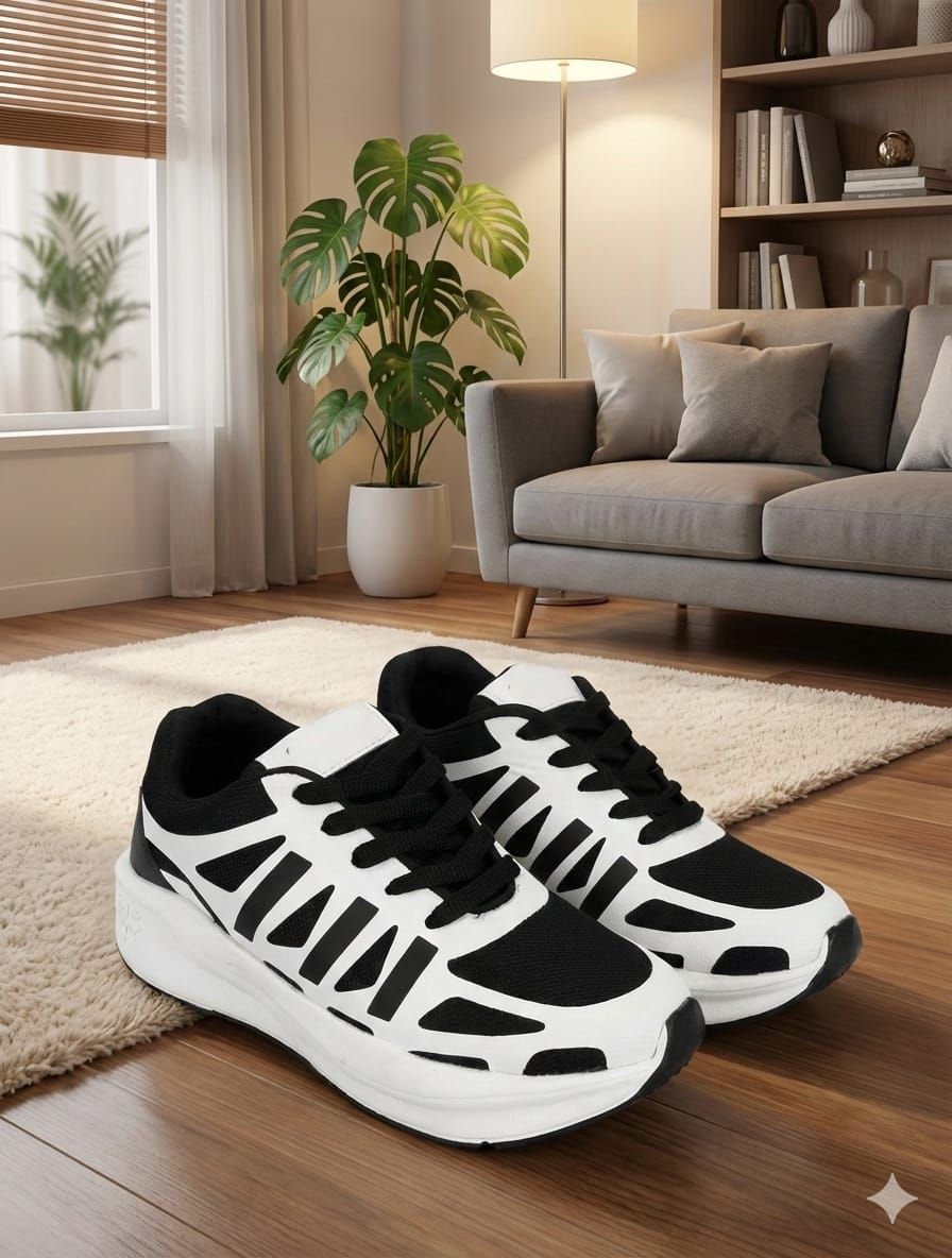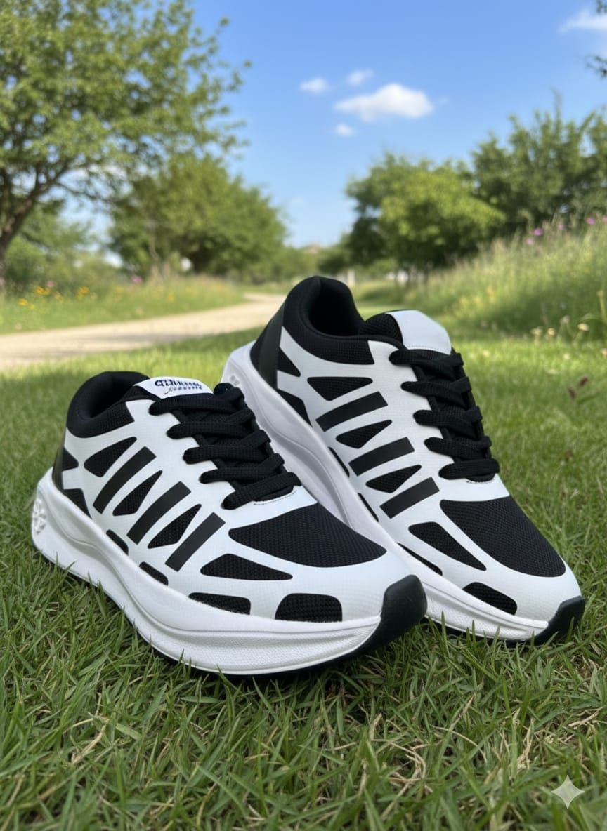 We are Elvomens, a leading Manufacturer, Exporter, and Supplier of high-quality Lightweight Black and White Men's Sports Shoes. Crafted with Synthetic inner material and PU sole material, these lace-up sports shoes offer comfort and style for any size. Designed for men, these black and white sports shoes are perfect for various activities. Each pair comes in a sturdy box packaging. Elevate your sports performance with Elvomens Sports Shoes.
